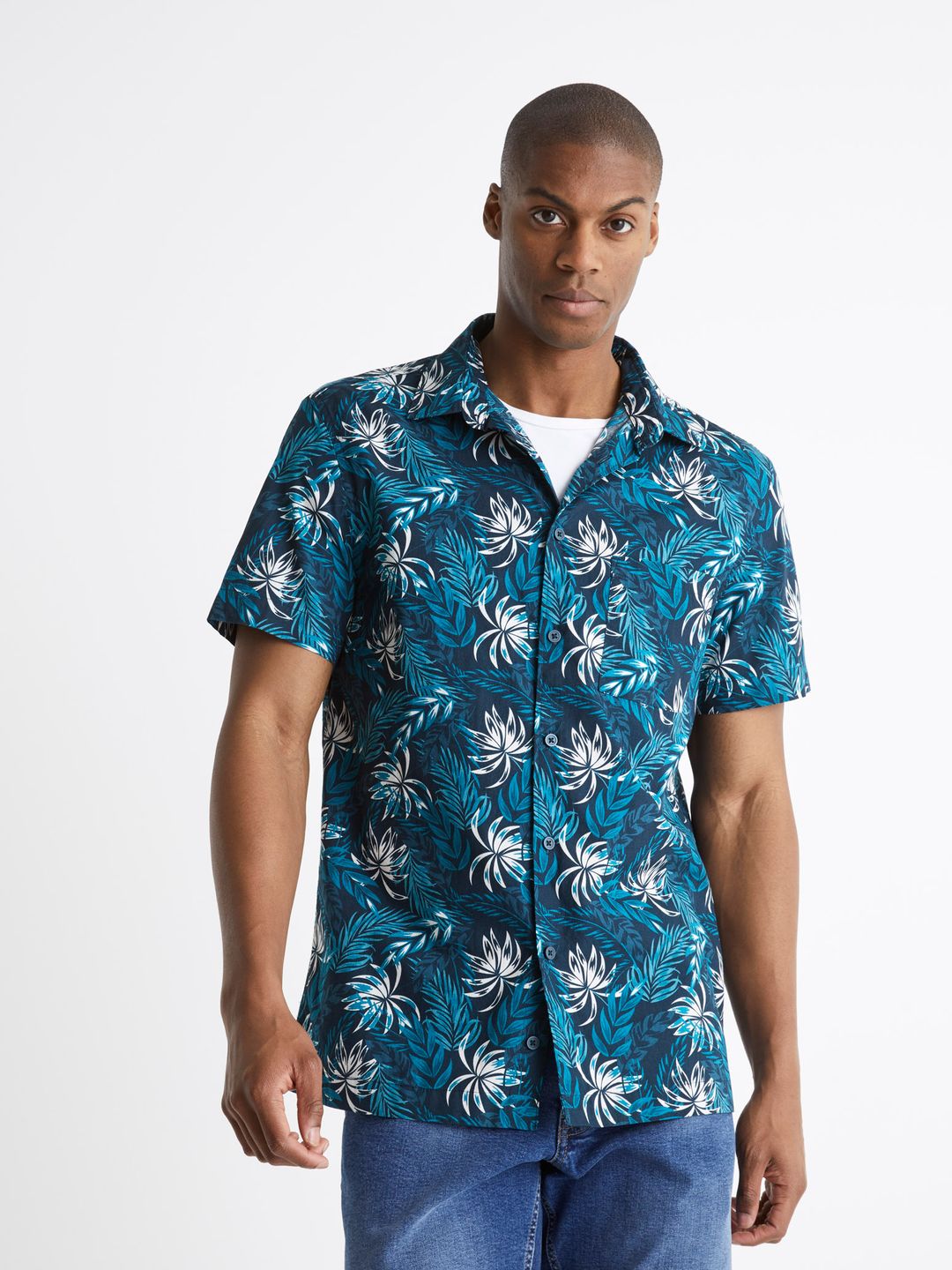 Bavlnená košeľa s krátkym rukávom a plošným vzorom. Klasický golier a vrecko na hrudi. Celozapínacie na gombíky.