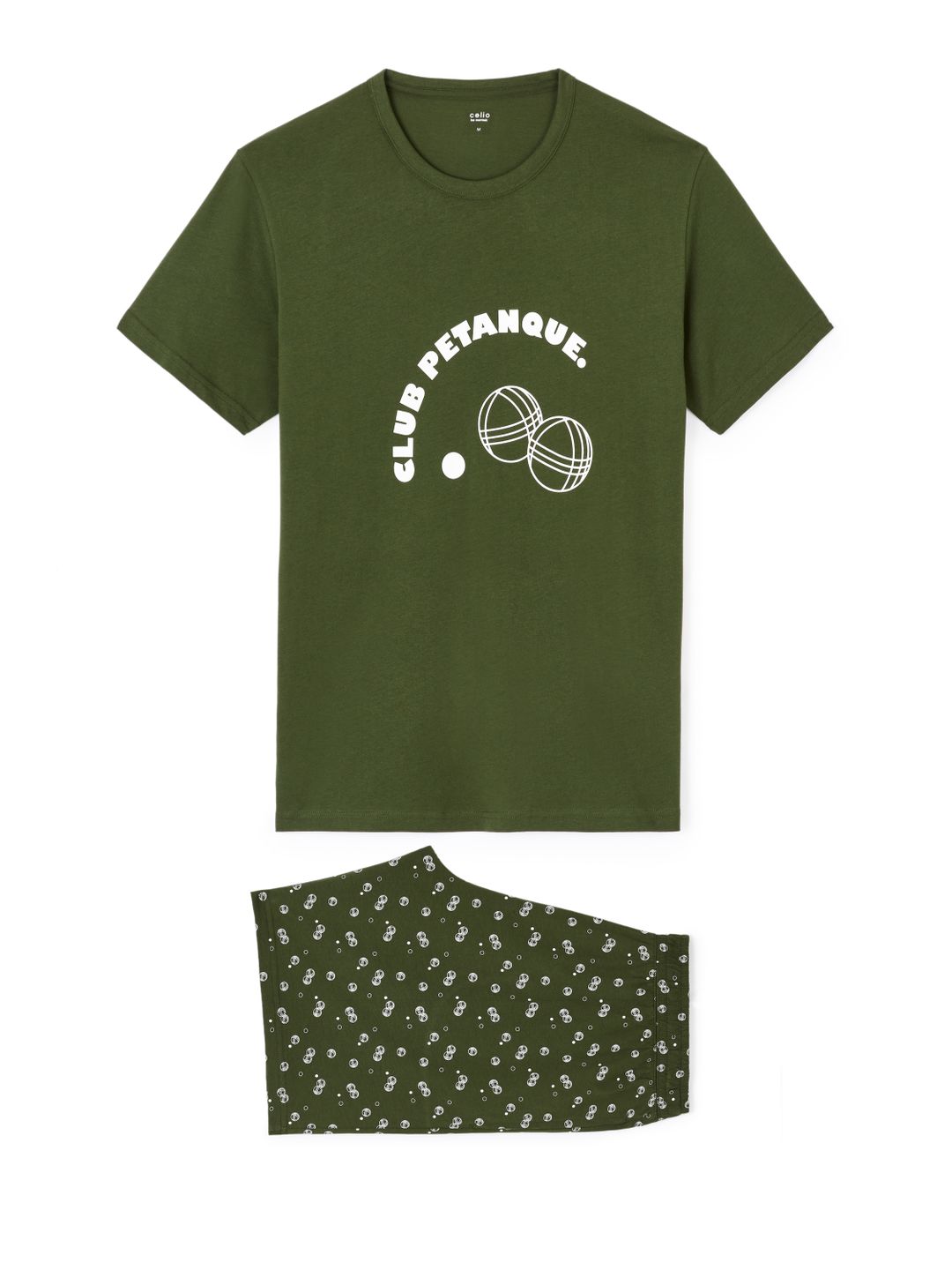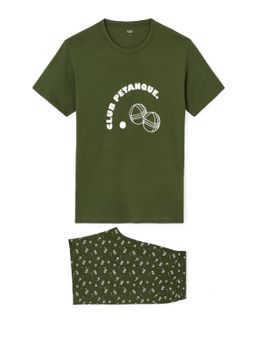 Nočné pohodlné pyžamo do letných dní. Horná časť pyžama s krátkym rukávom a okrúhlym výstrihom so vzorom pétanque na prednej strane. Stredne dlhé šortky so vzorom pétanque. Vyrobené zo 100% bavlny.