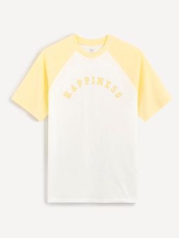 Čisto bavlnené tričko v bielej farbe a s nápisom Happiness. Tričko má krátke raglánové rukávy v žltej farbe. Okrúhly výstrih ku krku so žltým úzkym nápletom. Pekné tričko sa hodí ku kraťasom aj džínsom.