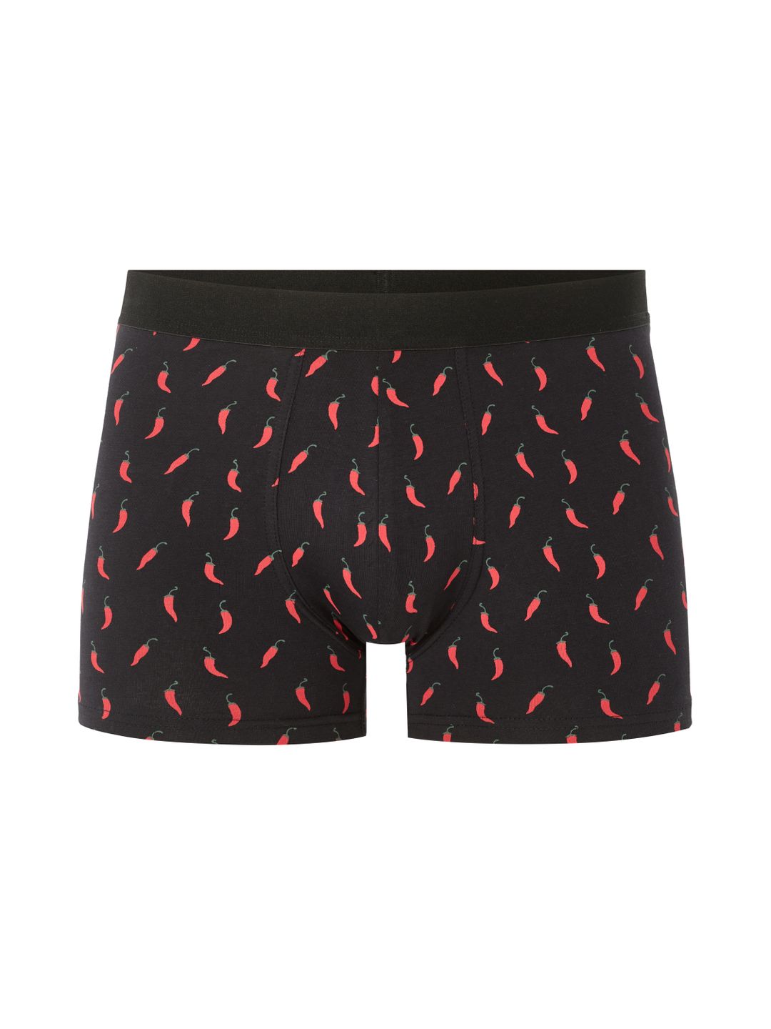 Pánske boxerky z organickej strečovej bavlny s elastickým pásom a vzorom chilli papričiek, pohodlné a štýlové na každý deň.