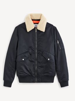 Bunda bomber s golierom z umelého baránka. Zapína sa na zips a má našité veľké vrecká s chlopňou. Pružné náplety na rukávoch a v spodnej časti bundy. Bunda má lesklú prešívanú podšívku a je zateplená. Strih do pása. Najlepšie vynikne k džínsom so svetrom.