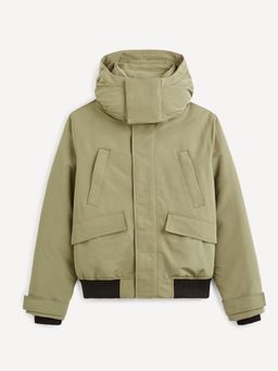 Bunda do chladného počasia. Vybavená kapucňou s vysokým stojačikom a zapínaním na suchý zips. Podšívka je prešívaná a s výplňou z recyklovaného materiálu. Tkanina je vodoodpudivá, aby odolala dažďu. Zapína sa na zips a kryciu chlopňu na suchý zips. Na prednej strane horné šikmé vrecká na zips a spodné vrecká s chlopňou. Rukávy s pružným nápletom a sťahovacou manžetou. V spodnej časti bundy tiež pružný náplet.
