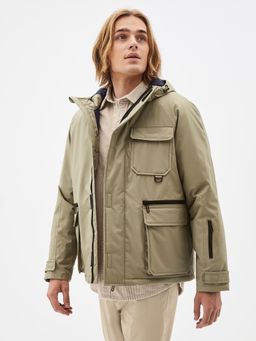 Zateplená bunda s výraznými vreckami. Rovný strih. Zapínanie na zips vrátane krycej chlopne. Kapucňa s vysokým golierom a sťahovacou šnúrkou. Rukávy je možné v zápästí stiahnuť. Skryté vnútorné vrecko na zips.