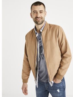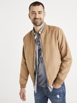 Štýlový bomber v béžovej farbe. Klasický strih letecké bundy so zapínaním na zips. Pružné náplety a predné šikmé vrecká. Skryté vnútorné vrecko na zips.