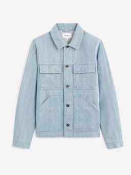 Džínsová bavlnená bunda s košeľovým golierom. Veľké 4 predné vrecká. Zapínanie na gombíky. Rovný strih a rukávy s manžetou.