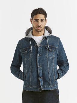 Džínsová bunda v modrej farbe s odopínacou kapucňou. Kapucňa s teplákoviny v šedej farbe a sťahovacou šnúrkou. Klasický strih džísky. Dve vrecká s klopami a dve šikmé bočné vrecká. Bavlna s elastanom.