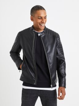 Motorkárska bunda zo syntetiky. Zapínanie na zips. Stojačik pri krku. Šikmé bočné vrecká na zips.