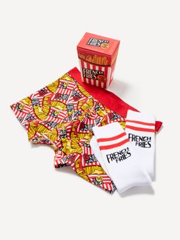 Darčekové balenie v tvare krabičky s hranolkami. Balenie obsahuje bavlnené boxerky s vzorom a pružným pásom s nápisom be normal a jeden pár ponožiek v bielej farbe. Skvelý darček pre veľkých jedákov hranoliek!