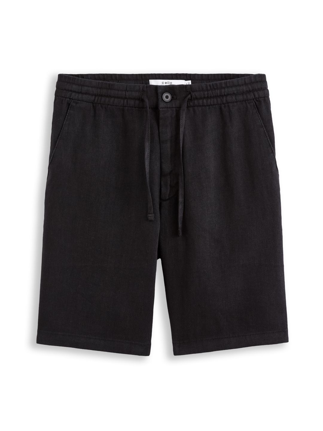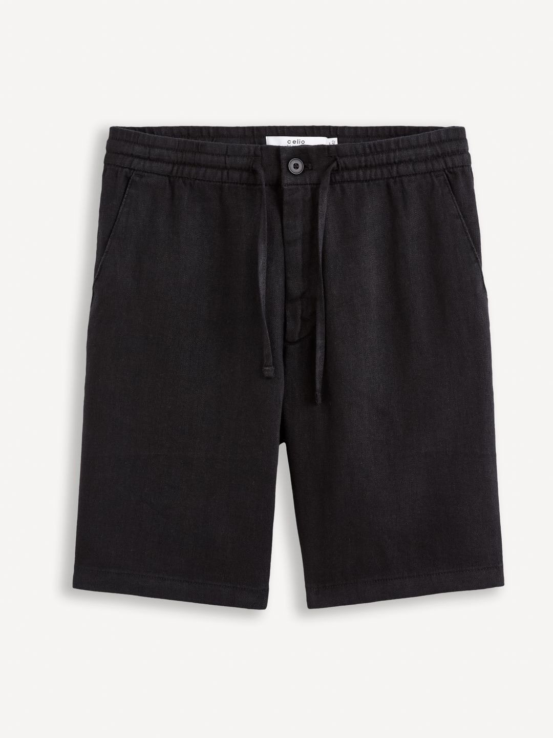 Ľanové krátke nohavice s pružným pásom. V páse sťahovacia šnúrka. Predné šikmé vrecká. Zadné vrecko so zapínaním na gombík.