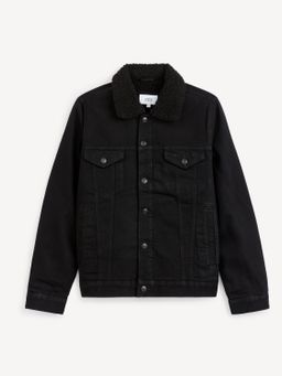 Zateplená džínsová bunda v čiernej farbe. Košeľový golier s umelým baránkom v čiernej farbe. Klasický strih so zapínaním na kovové gombíky v striebornej farbe. Náprsné vrecká s chlopňou a šikmé bočné vrecká. Dlhé rukávy s manžetou.