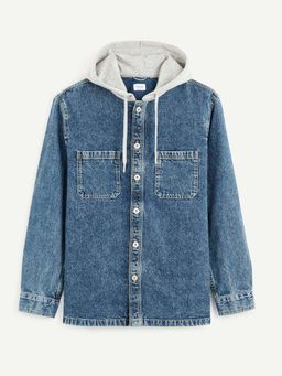 Džínsová košeľa s kapucňou. Kapucňa je prišitá a má sťahovaciu šnúrku. Košeľa je bez goliera a celozapínacia. Na hrudi našité dve vrecká. Rovný strih a dlhé rukávy s manžetou. 100% bavlna.