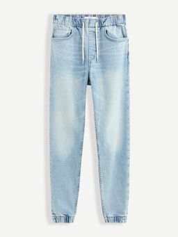Osvojte si trendy štýl týchto džínsových joggerov. Pohodlné džínsy sú vyrobené z bavlny s elastanom. Majú pružný pás so sťahovacou šnúrkou. Predné a zadné vrecká. Dlhé nohavice zakočené pružným lemom. Nosia sa s tričkom a rozopnutou košeľou.