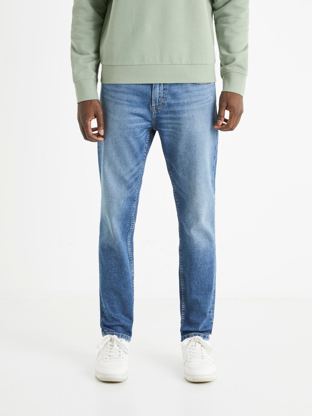 Bavlnené džínsy s elastanom. Pevný pás so zapínaním na zips a gombík. Pútka na opasok. Klasických 5 vreciek. Slim strih. Ozdobné prešitie. Džínsy skvele doplní mikina, prešívaná vesta alebo bunda.