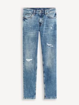 Džínsy v obľúbenom slim strihu. Džínsy majú klasické zapínanie na gombík a zips. Nechýbajú pútka na opasok a 5 vreciek. Zámerne roztrhané džínsy najlepšie doplníš tričkom alebo košeľou.