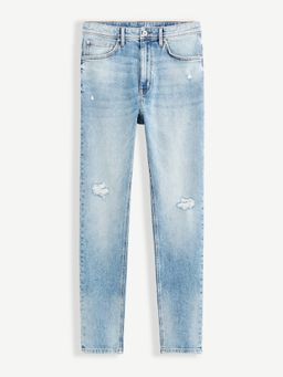 Pohodlné džínsy v modrej farbe. Zámerne módne vyšúchané. Klasické zapínanie na zips a gombík. Pohodlný vyšší pás. Predné a zadné vrecká. Bavlnené s elastanom.