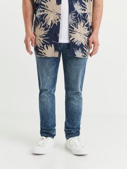 Pohodlné džínsy v modrej farbe. Zámerne módne vyšúchané. Klasické zapínanie na zips a gombík. Pohodlný vyšší pás. Predné a zadné vrecká. Bavlnené s elastanom.