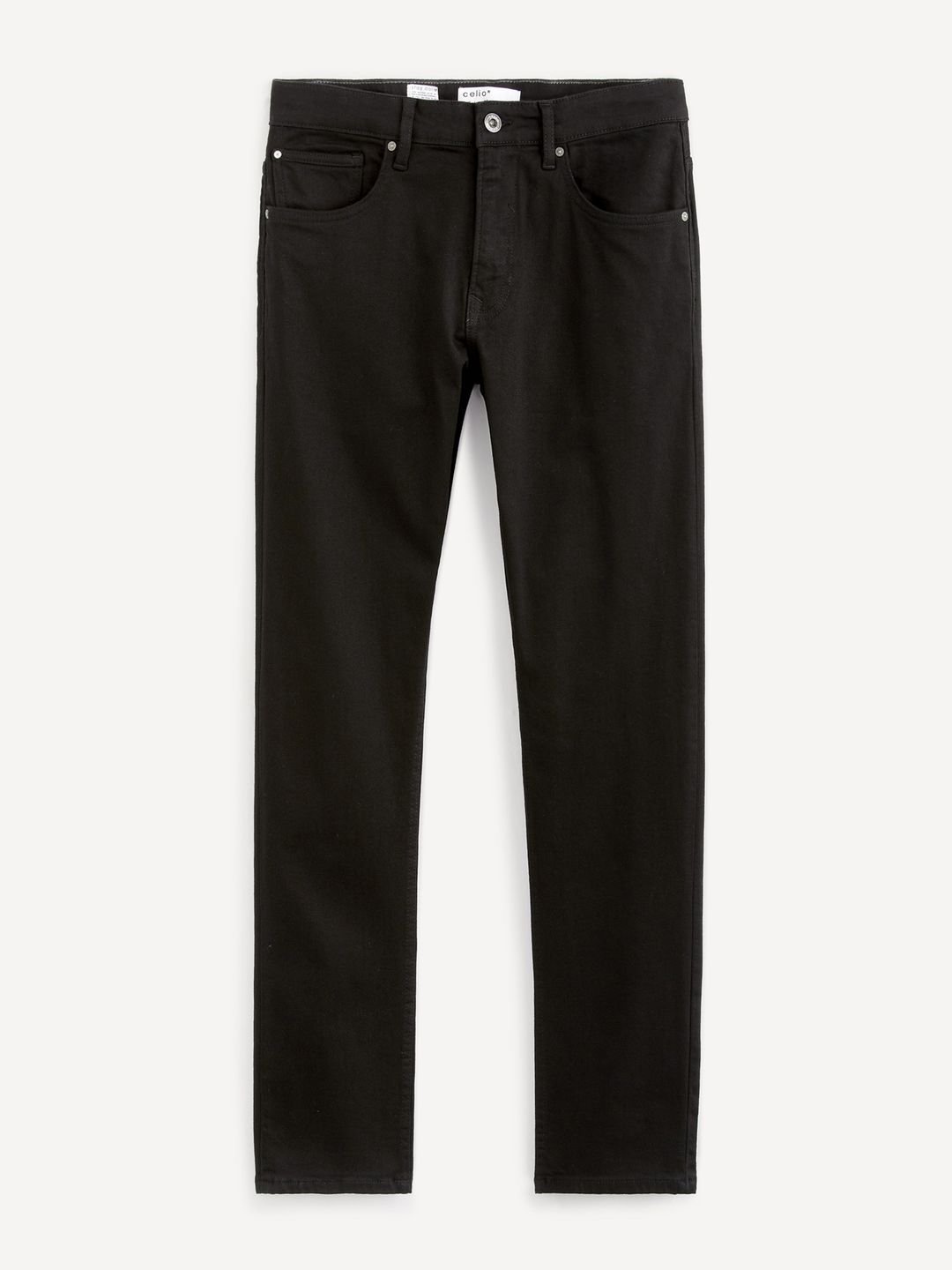 Pohodlné džínsy straight. Čierne s prešitím tón v tóne. Klasické zapínanie na zips a gombík. Štandardných 5 vreciek. S obsahom elastanu.