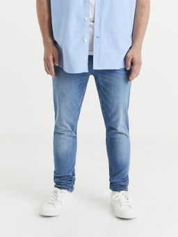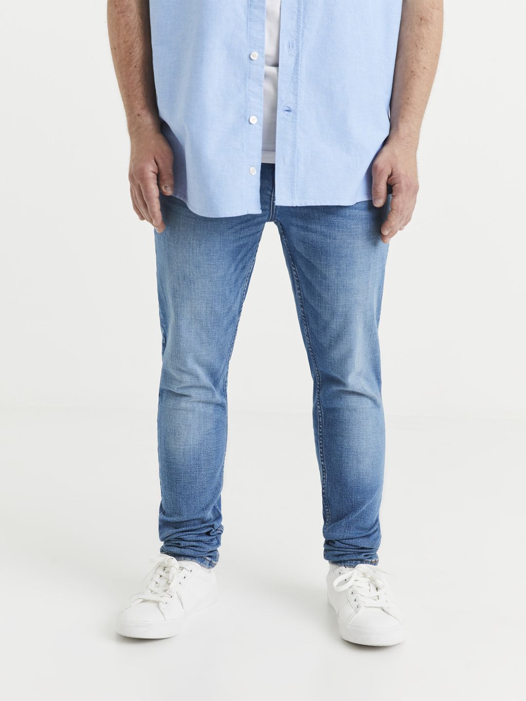 Modré džínsy s ľahko spraným vzhľadom. Upnutý skinny strih. Klasické zapínanie na zips a gombík. Pevný pás s pútkami na opasok. Štandardných 5 vreciek. Príjemný bavlnený materiál s elastanom.