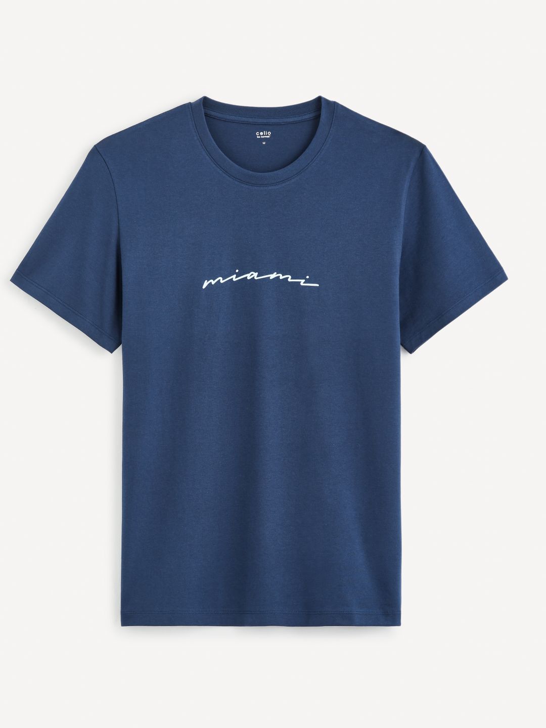 Bavlnené tričko s krátkym rukávom. Drobná potlač na prednej strane. Okrúhly výstrih a rovný strih.