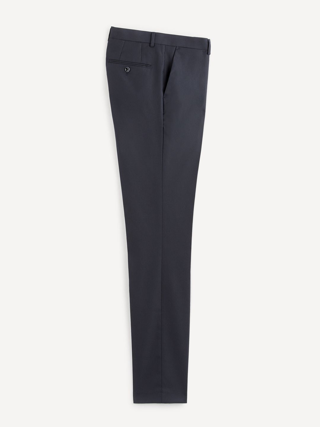 Nohavice oblekové v slim strihu. Klasické zapínanie na zips a gombík. Pevný pás s pútkami na opasok. Nažehlené puky. Nohavice možno prať.