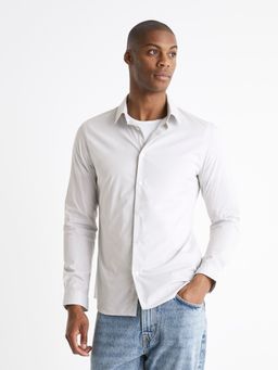 Košeľa v slim strihu. Vďaka elastanu košeľa perfektne padne. So zapínaním na drobné gombíky. Pri krku moderný kratší golier. Dlhé rukávy zakončené širokou manžetou. Zaoblený spodný lem.