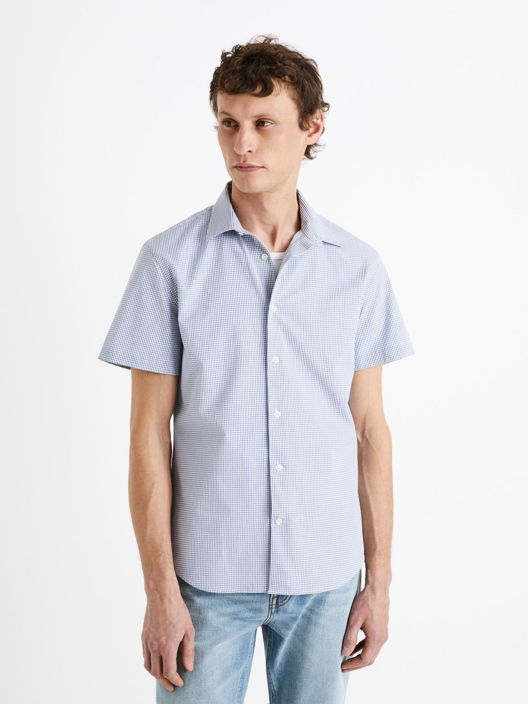 Jednofarebná košeľa s krátkym rukávom. Slim strih. Golierik a zapínanie na gombíky. Zaoblený spodný lem.