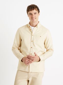Jednofarebná košeľa v strihu regular a s dlhým rukávom. Tkaná bavlna s keprovou väzbou a leskom. Košeľa má kratší golier so zapínaním na gombíky. Na hrudi je našité vrecko, ktoré sa zapína na jeden gombík. Dlhé rukávy s manžetou. Celozapínacie, béžovo-hnedé gombíky.