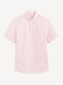 Pruhovaná košeľa s drobnými prúžkami. Golierik a zapínanie na gombíky. Na hrudi našité vrecko. Rovný strih.