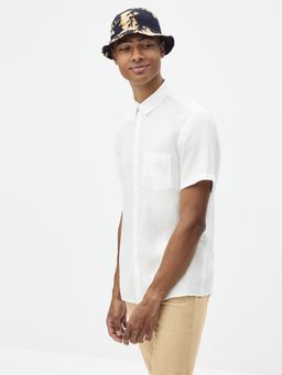 Ľanová košeľa vo voľnom regular strihu. Neformálne košeľa so stojačikom pri krku. Krátke rukávy sa zapínanie na gombíky.