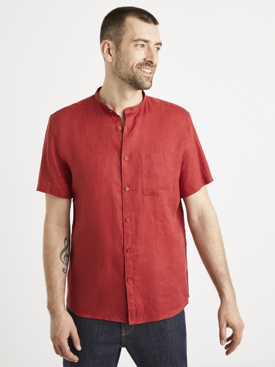 Ľanová jednofarebná košeľa v regular strihu. Stojačik pri krku a krátky rukáv.