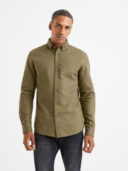 Jednofarebná bavlnená košeľa s dlhým rukávom. Moderný krátky golier. Dlhé rukávy a zapínanie na gombíky.