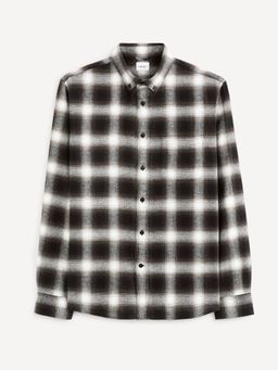Kockovaná košeľa so zapínaním na gombíky. Klasický golier. Vrecko na hrudi. Dlhé rukávy s manžetou.