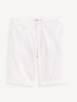 Džínsové šortky s pevným pásom. Zapínanie na zips a gombík. Pútka na širší opasok. Predné a zadné vrecká. Zarolované konce nohavíc. Príjemný materiál s elastanom.