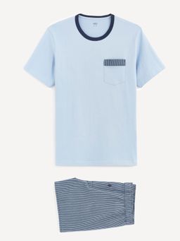 Krátke pyžamo zo 100% bavlny. Tričko s krátkym rukávom a vreckom na hrudi. Pruhované trenírky s pružným pásom. Rázporok so zapínaním na gombík.