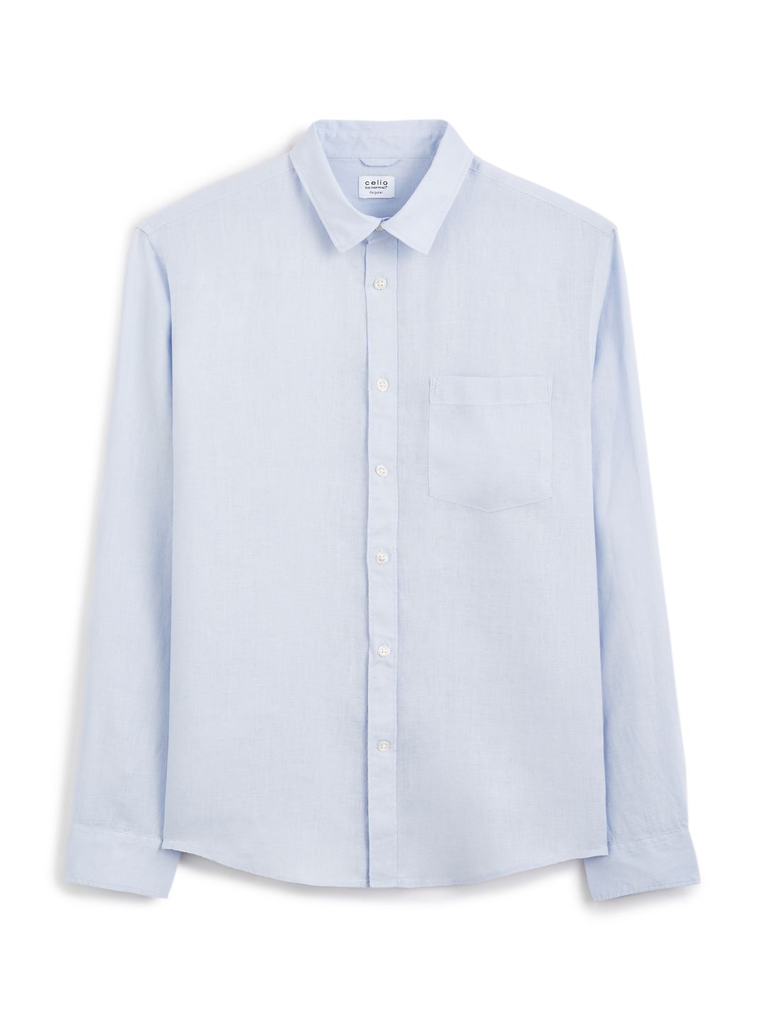 Ľanová košeľa s dlhým rukávom. Klasický golierik a zapínanie na gombíky. Na hrudi našité malé vrecko. Rovný strih.