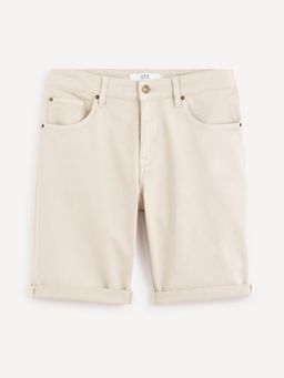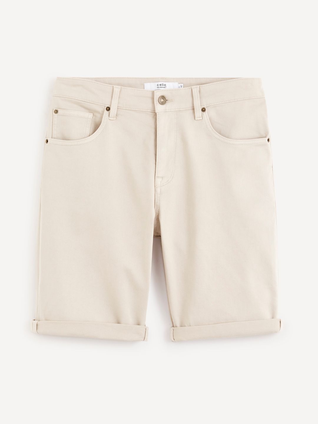 Elastické plátenné šortky. Pevný pás s pútkami na opasok. Zapínanie na gombík a zips. S 5 vreckami. Šortky doplňte jednofarebným tričkom a farebnou košeľou.