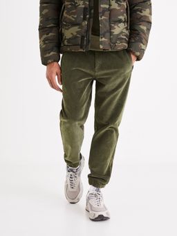 Športové menčestrové nohavice. Klasické zapínanie na zips so sťahovaciou šnúrkou. Šikmé bočné vrecká. Nohavice zakončené pružným lemom. Jednofarebné.