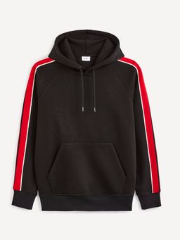 Mikina s kapucňou. Na rukávoch farebné pruhy v zelenej farbe. Kapucňa so sťahovacou šnúrkou. Klokanie vrecko. Široké a pružné náplety.