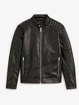 Motorkárska bunda z umelej kože. Na ramenách ozdobné prešitie. So zapínaním na zips. Pri krku stojačik so zapínaním na druk. Dve predné šikmé vrecká na zips. Dlhé rukávy so zipsom. Na vnútornej strane skryté vrecko.