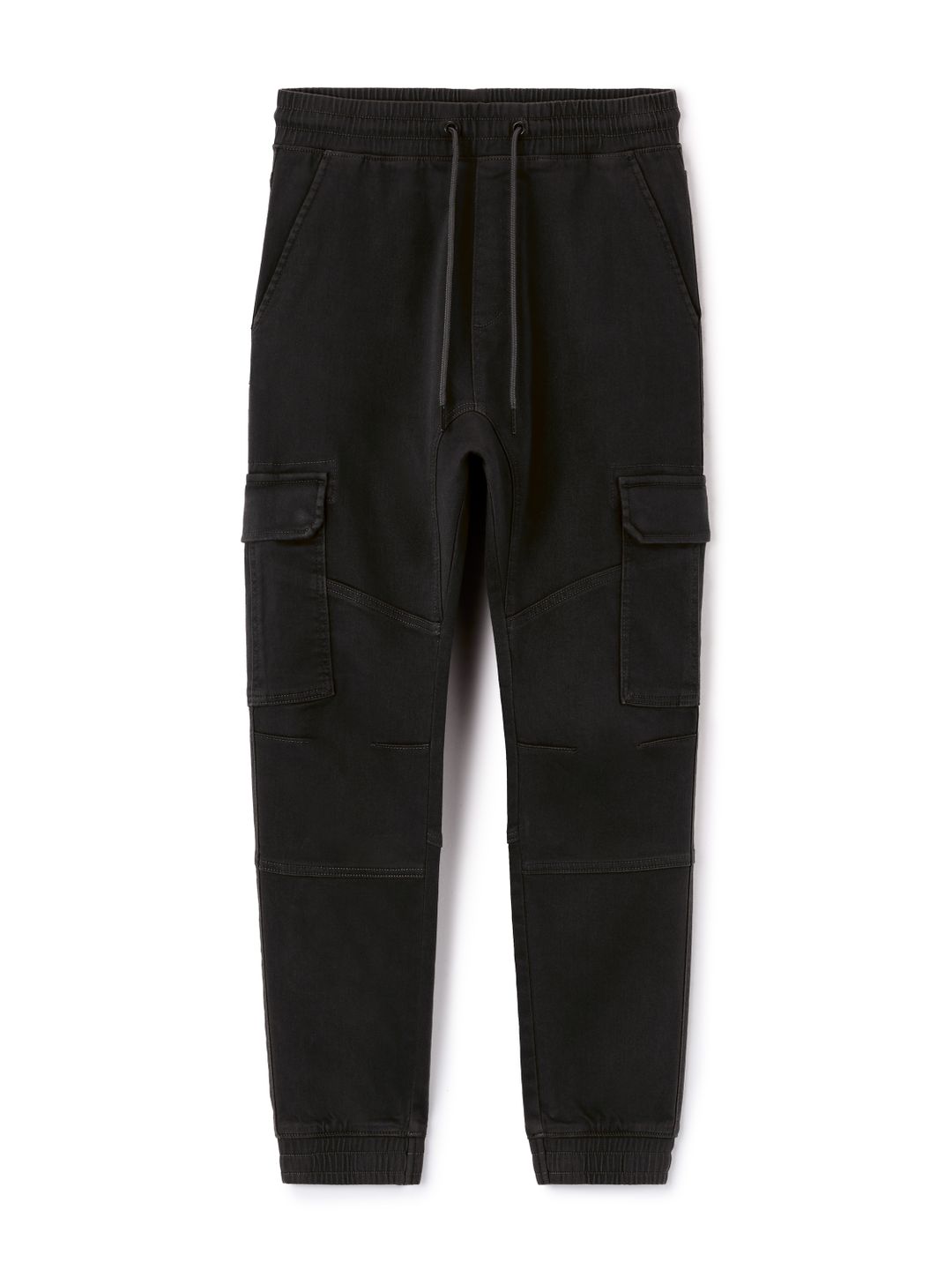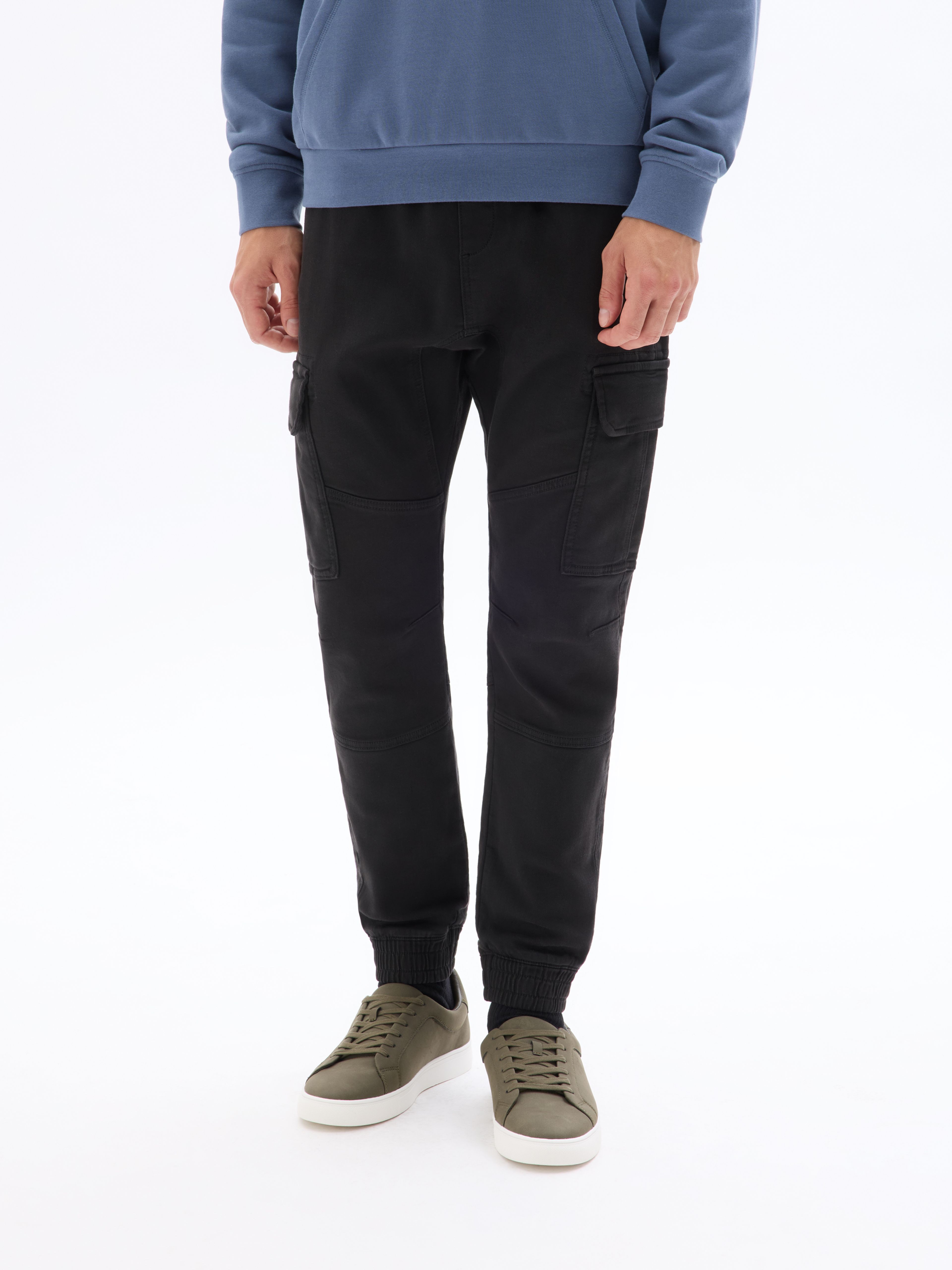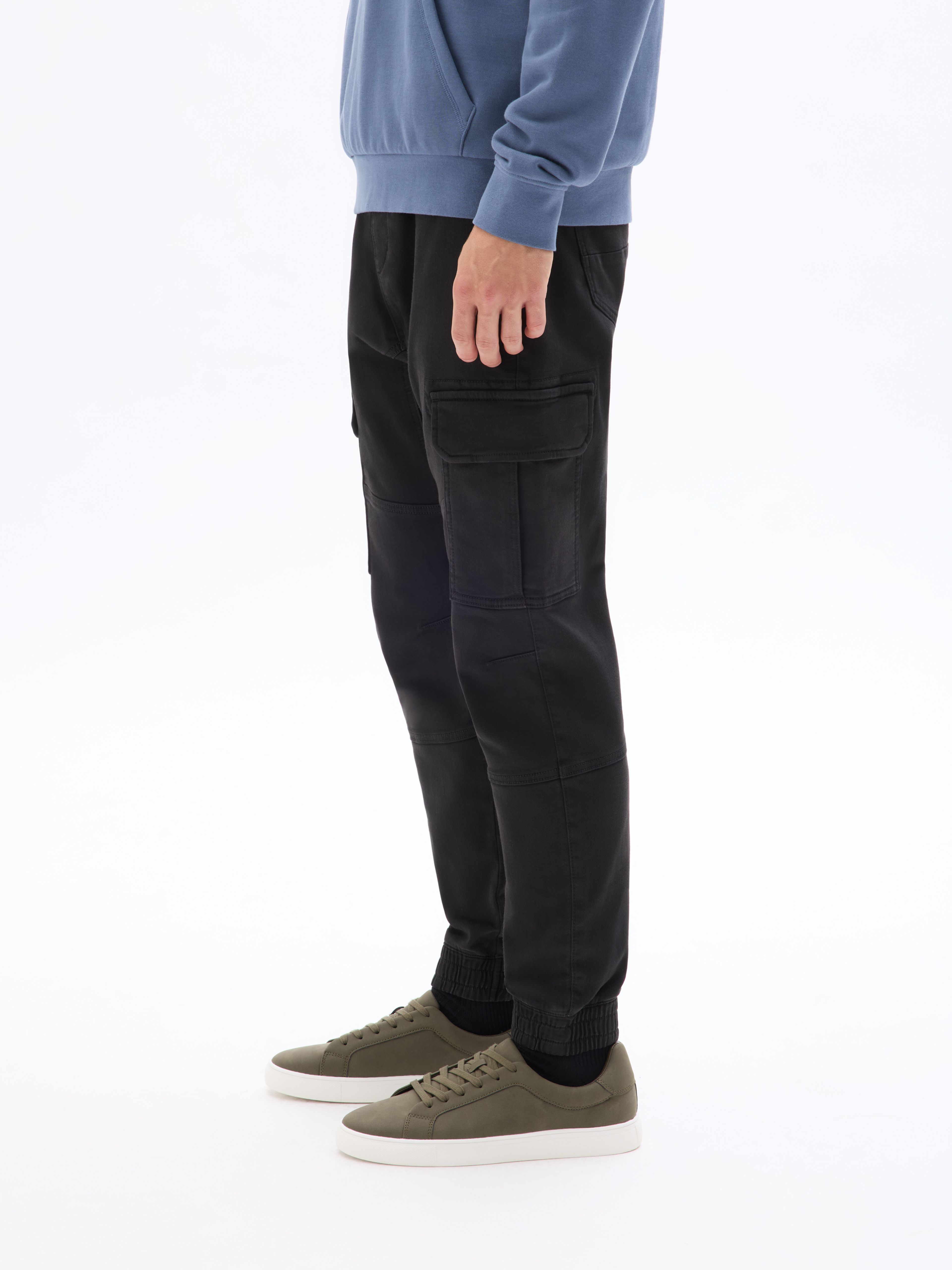 Nohavice kapsáče s pružným pásom. V páse navyše sťahovacia šnúrka. Predné šikmé vrecká a veľké vrecká s chlopňou. Zadné našité vrecká. Nohavice zakončené do pružného lemu. Jednofarebné a pružné. Nohavice na voľný čas.