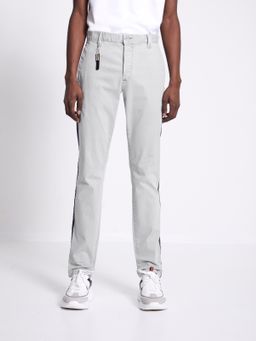 Nohavice s pevným pásom. Zapínanie na zips a gombík. Pútka na opasok. Predné šikmé vrecká. Zadné vrecká a bočné pruhy. Príjemný materiál.