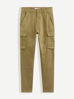 Nohavice kapsáče s pevným pásom. Zapínanie na zips a gombík. V páse pútka na opasok. Šikmé bočné vrecká. Zúžené nohavice. Bavlnené s elastanom.