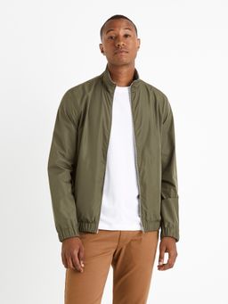 Obojstranná bunda na zips. Z jednej strany hladká tkanina a z druhej jersey. Pri krku krátky stojačik. Dlhé rukávy s pružným lemom. Predné šikmé vrecká.