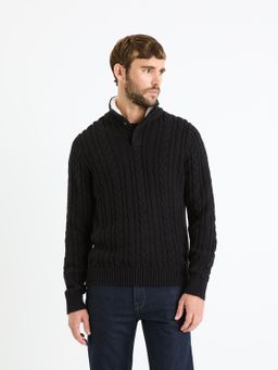 Pletený sveter s vrkočovým vzorom. Pri krku vysoký stojačik so zapínaním na druky. Pružné rebrované lemy.