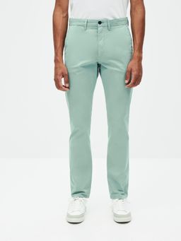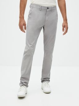 Nohavice slack v straight strihu. Pevný pas so zapínaním na zips a gombík. Nechýbajú pútka na opasok. Šikmé bočné vrecká a zadné vrecká. Svetlo šedá farba. Bavlnené s elastanom.