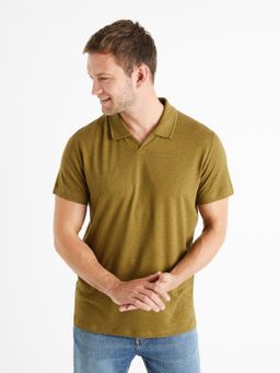 Jednofarebné polo tričko s krátkymi rukávmi. Mäkký úplet z bavlny a ľanu. Roztiahnutý golier a bez zapínania. Rovný strih.