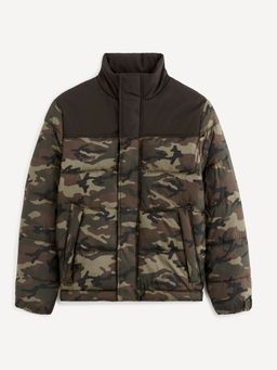 Prešívaná zimná bunda v army štýle. Maskáčový vzor. Vysoký golier a šikmé bočné vrecká. Vnútorné vrecko.
