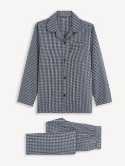 Bavlnené kockované pyžamo. Pyžamový kabátik so zapínaním na gombíky. Na prednej strane našité vrecko. Pri krku rozhalenka. Nohavice s pružným pásom. Dlhé rukávy a nohavice.