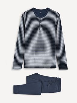 Príjemné pyžamo z bavlneného úpletu. Pruhované tričko s dlhým rukávom. Okrúhly výstrih so zapínaním na gombíky. Jednofarebné nohavice s pružným pásom a sťahovacou šnúrkou. V darčekovom balení.