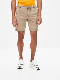Kraťasy jogger so sťahovacou šnúrkou v páse. Predné šikmé vrecká. Zarolované konce nohavíc. Zadné vrecká a pružný pás. Bavlna s elastanom.